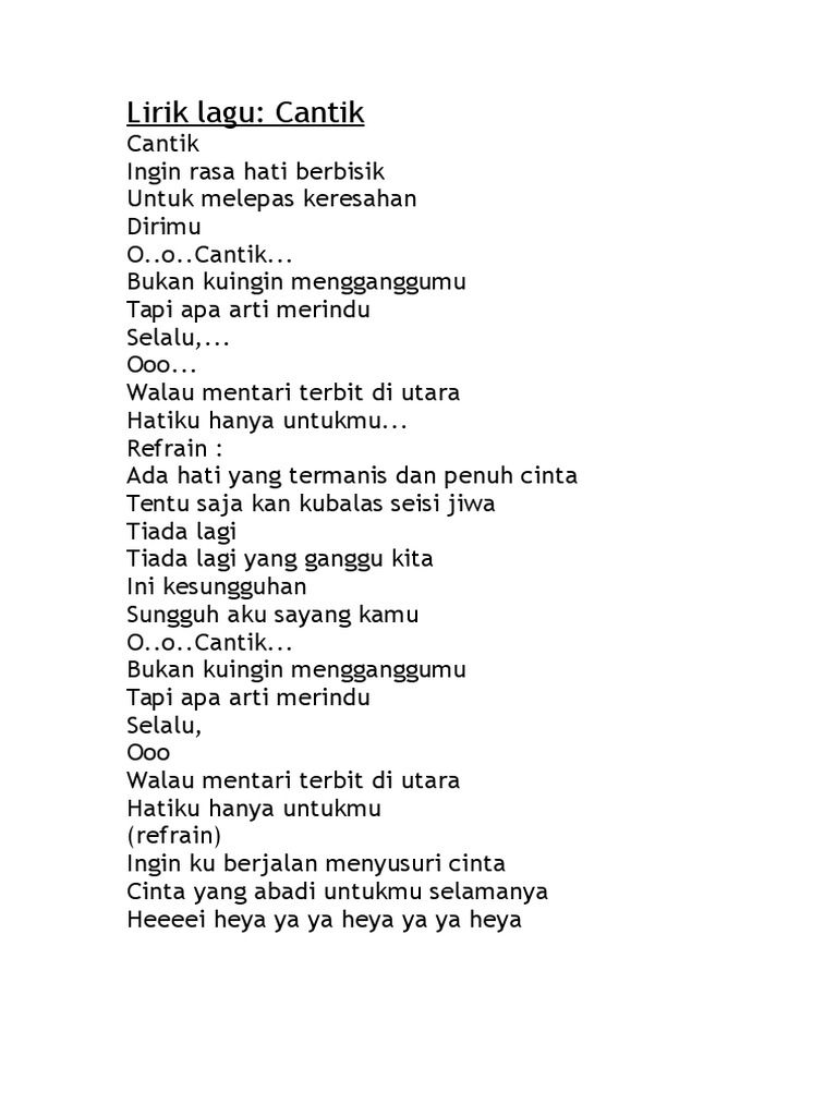. Ingin rasa hati berbisik. Lirik Lagu Cantik - Kahitna. C C F C Cantik ingin rasa hati berbisik F Em Dm G Untuk melepas keresahan dirimu ouwo C F C Cantik bukan ku ingin menganggumu F Em Dm G Tapi apa arti merindu selalu owo wo F Dm Walau mentari terbit di utara F Bb G Hatiku hanya untukmu Reff.
